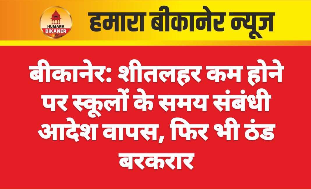 बीकानेर। बीकानेर में पिछले दिनों तेज ठंड व शीतलहर के चलते जनजीवन अस्त व्यस्त हो गया था। इसी को ध्यान में रखते हुए जिला कलक्टर नम्रता वृष्णि ने 11 जनवरी को एक आदेश जारी जिले की सभी राजकीय व निजी स्कूलो का समय सुबह 10 बजे से शाम 4 बजे तक किया था। चूंकी अब शीतलहर का प्रभाव कम हो गया है तो इसको ध्यान में रखते हुए पहले किये गये आदेश को प्रत्याहारित किया गया है। अब सभी स्कूलें पहले की भांति सुबह से दोपहर तक लगा सकती है। निजी स्कूल संचालक अपने स्तर पर समय में परिवर्तन कर सकते है।