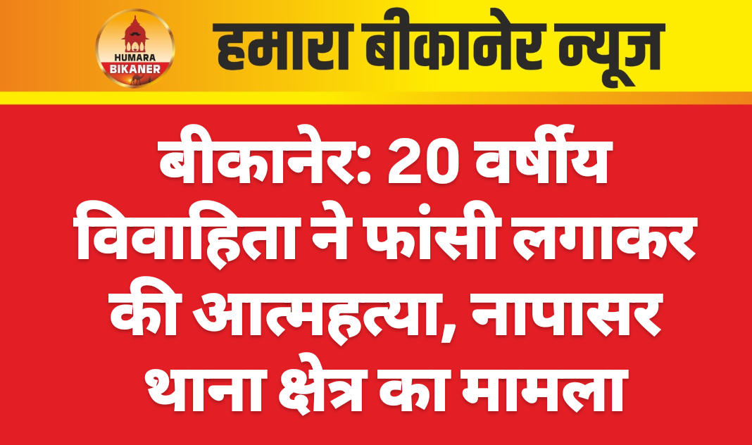 बीकानेर।विवाहिता द्वारा फांसी लगाकर सुसाइड करने की खबर सामने आयी है। घटना नापासर पुलिस थाना क्षेत्र से जुड़ी है। जहां पर 20 वर्षीय विवाहिता किसना पत्नी अनिल ने फांसी का फंदा लगाकर आत्महत्या कर ली। इस सम्बंध में मृतका के मामा सदानाथ ने रिपोर्ट दी है। परिवादी ने बताया कि भाणजी किसना हेमेरा रोही में खेत काश्त करती थी। जिसकी मानसिक स्थिति ठीक नहीं थी। जिसके चलते फांसी लगाकर सुसाइड कर लिया। पुलिस ने मर्ग दर्ज कर जांच शुरू कर दी है।