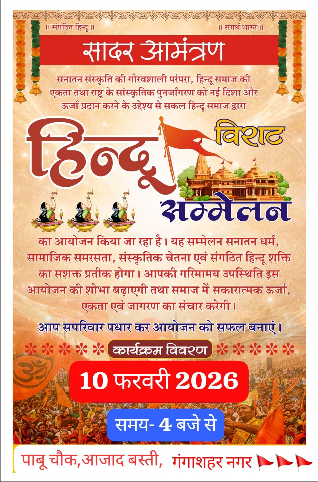 आयोजकों ने समस्त धर्मप्रेमी जनता से अपील की है कि अधिक से अधिक संख्या में पहुंचकर इस विराट हिंदू सम्मेलन को सफल बनाएं।