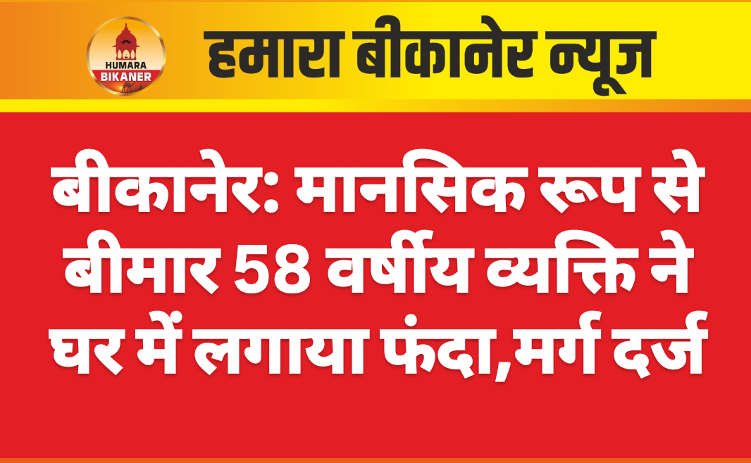 बीकानेर।मानसिक रूप से बीमार व्यक्ति द्वारा सुसाइड करने की खबर सामने आयी है। घटना मुक्ताप्रसाद पुलिस थाना क्षेत्र के रामपुरा बस्ती गली नंबर 4 में 14 फरवरी की शाम की है। इस सम्बंध में मृतक के बेटे अशोक कुम्हार ने रिपोर्ट दी है। परिवादी ने बताया कि उसके 58 वर्षीय पिता गोवर्धन पुत्र धुनाराम जो कि काफी समय से मानसिक रूप से बीमार थे। जिसके चलते उसके पिता ने परेशान होकर घर के कमरे में फांसी लगाकर जीवनलीला समाप्त कर ली। पुलिस ने प्रार्थी की रिपोर्ट के आधार पर मर्ग दर्ज कर जांच शुरू कर दी है।