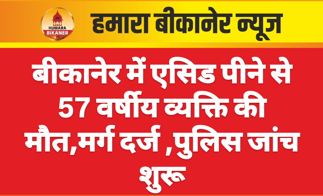 बीकानेर। शौचालय में पड़ी एसिड पीने से व्यक्ति की मौत हो जाने की खबर सामने आयी है। घटना गंगाशहर पुलिस थाना क्षेत्र के कुम्हारों के मोहल्ले हनुमान मंदिर के पास वार्ड नंबर 4 भीनासर में 17 फरवरी की शाम को 6 बजे के आसपास की है। इस सम्बंध में मृतक के बेटे किशोर कुमार ने रिपोर्ट दी है। परिवादी ने बताया कि उसके 57 वर्षीय पिता खेमाराम ने घर के शौचालय में पड़ी एसिड पी लिया। जिससे उसके पिता की तबीयत खराब हो गयी और उन्हें पीबीएम अस्पताल में भर्ती करवाया गया। जहंा पर इलाज के दौरान उसके पिता की मौत हो गयी। पुलिस ने प्रार्थी की रिपोर्ट पर मर्ग दर्ज कर जांच शुरू कर दी है।