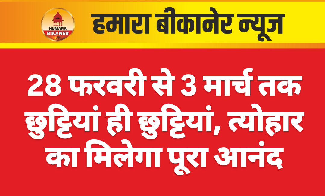 बीकानेर। होली से पहले आमजन के लिए बड़ी खुशखबरी है। इस बार त्योहार के मौके पर लगातार चार दिन का लंबा अवकाश मिलने जा रहा है। राज्य सरकार की छुट्टियों और साप्ताहिक अवकाश के चलते स्कूल-कॉलेज, बैंक और कई सरकारी दफ्तर लगातार बंद रहेंगे, जिससे लोगों को त्योहार मनाने के लिए ज्यादा समय मिलेगा।अवकाश की शुरुआत 28 फरवरी (शनिवार) से होगी। महीने का चौथा शनिवार होने के कारण बैंक, कई सरकारी कार्यालयों के साथ कई स्कूल-कॉलेजों में भी छुट्टी रहेगी। इसके बाद 1 मार्च (रविवार) को नियमित साप्ताहिक अवकाश रहेगा। रविवार की छुट्टी जुड़ने से लोगों को लगातार दूसरा दिन आराम का मिलेगा। बाजारों में भी इस दिन त्योहार की खरीदारी का खासा उत्साह देखने को मिल सकता है।