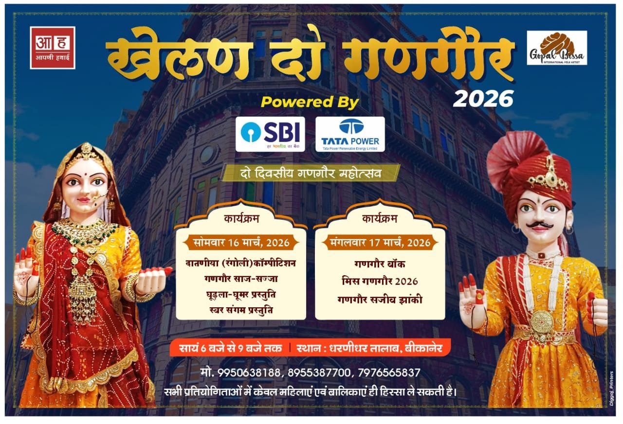 मरुधरा की माटी में गणगौर उत्सव का आध्यात्मिक महत्व है। इसी परंपरा को जीवंत रखते हुए धर्मनगरी बीकानेर में आपणी हथाई न्यूज पोर्टल और अंतराष्ट्रीय लोक कलकार गोपाल बिस्सा द्वारा हर साल की भांति इस साल भी आगामी 16 और 17 मार्च 2026 को दो दिवसीय ‘खेलण दो गणगौर’ महोत्सव’ का भव्य आयोजन किया जा रहा है। यह कार्यक्रम शाम 6:00 बजे से रात 9:00 बजे तक धरणीधर तालाब में आयोजित किया जाएगा।इस आयोजन को स्टेट बैंक ऑफ इंडिया (SBI) और टाटा पावर द्वारा प्रायोजित किया गया है।